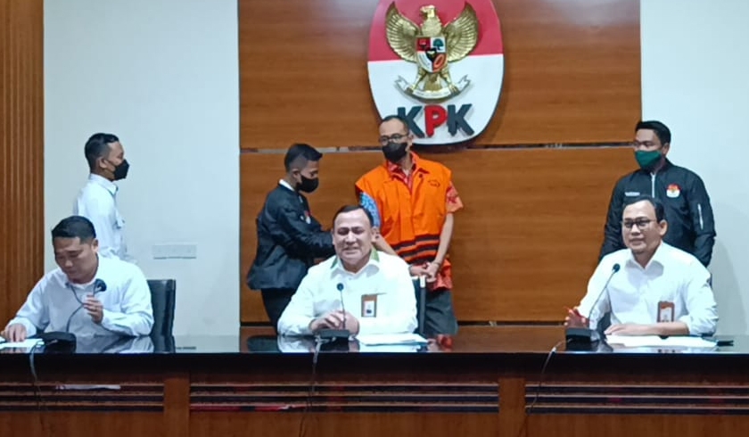 Tersangka Rafael Alun Trisambodo mengenakan rompi tahanan dengan tangan terborgol