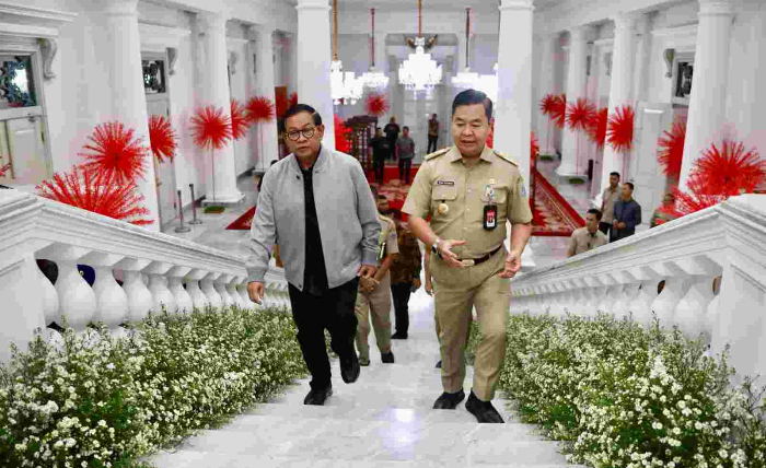 Pj Gubernur DKI Jakarta Teguh Setyabudi menerima kunjungan Gubernur DKI Jakarta Terpilih Pramono Anung di Balai Kota DKI Jakarta dan menemani Pramono Anung berkeliling sambil memperkenalkan beberapa ruangan di Balai Kota, Selasa (4/2/2025)/Diskominfotik.